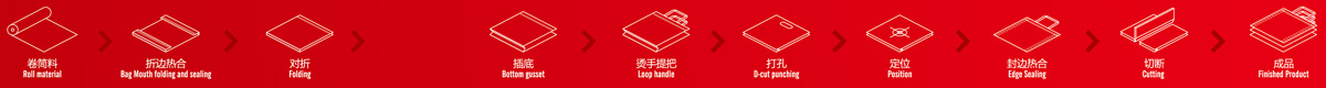 工序流程:卷筒料一折邊一穿繩一熱合-對(duì)折一插邊-定位~-打 孔---熱合---切斷---收集成品。